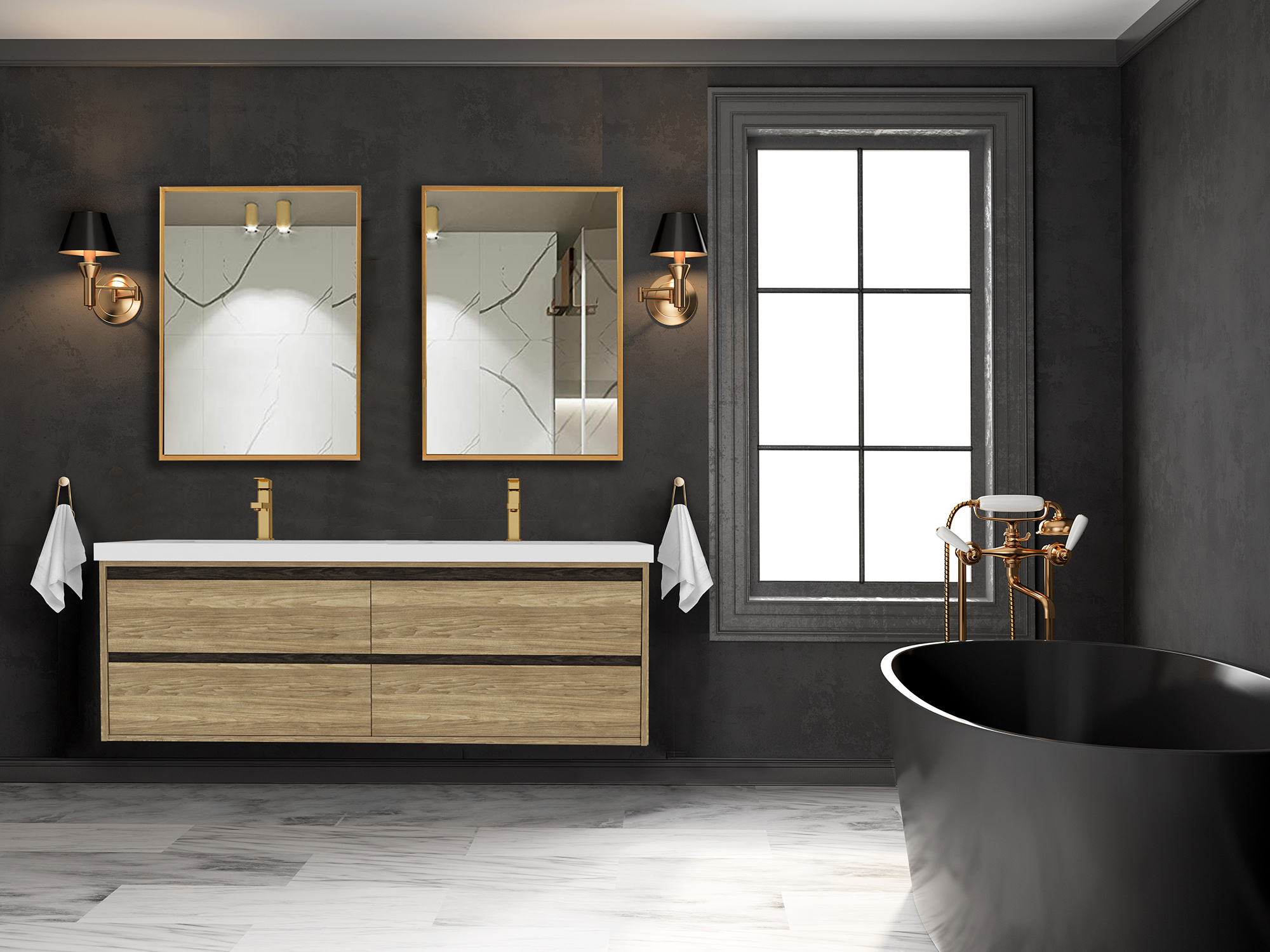 Complete the look with matching AFINA mirrors, thoughtfully designed to pair seamlessly with the vanities for a cohesive and stylish bathroom environment.
